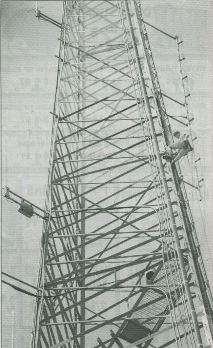 High above Anderson College, Marcel Klauser of The Klauser Corp. in Anderson makes preparations on Tuesday to hang a microwave radio dish on the 300-foot-high radio tower. Many businesses rent space on the tower, which originally was erected as a television tower for WAIM television. The tower is scheduled to be painted starting next week.
